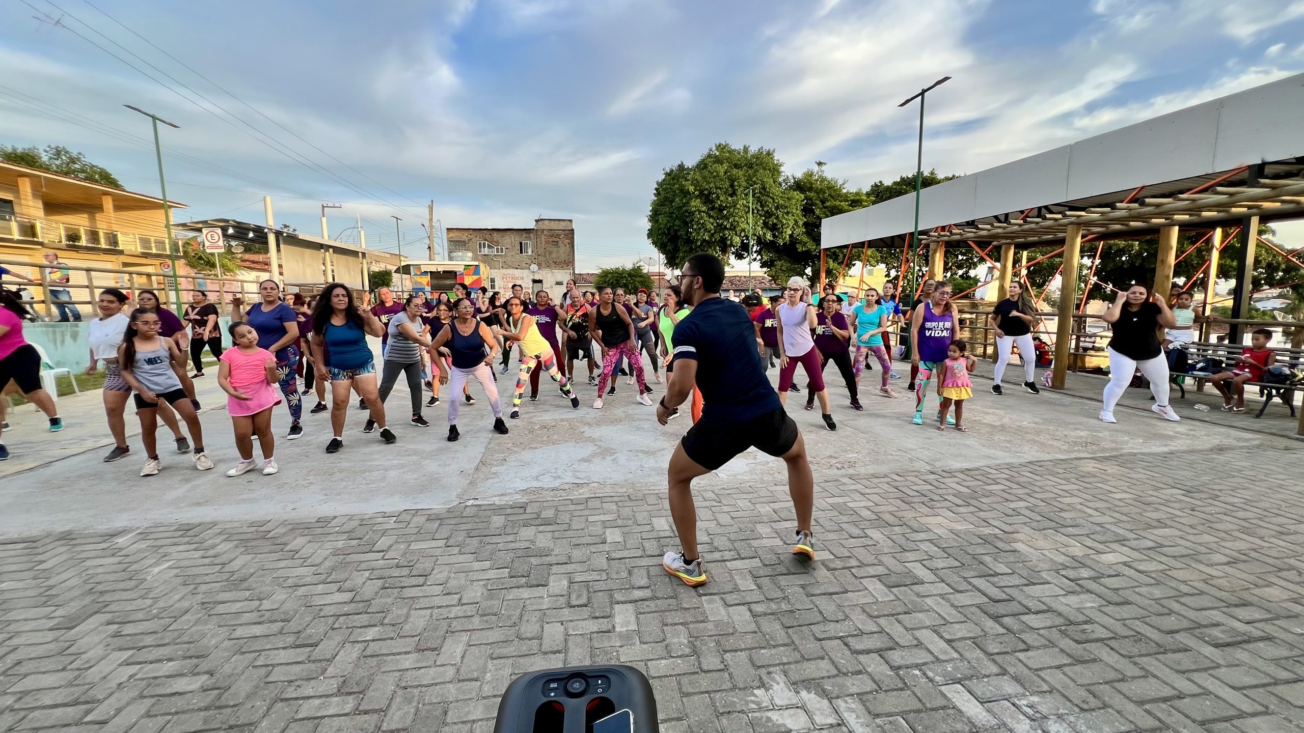 O aulão aconteceu no pátio de atividades da Academia da Saude e teve a participação de servidores da SMS e dos usuários dos serviços da academia. Os instrutores Henrique e Larissa ficaram por conta de animar os alunos.