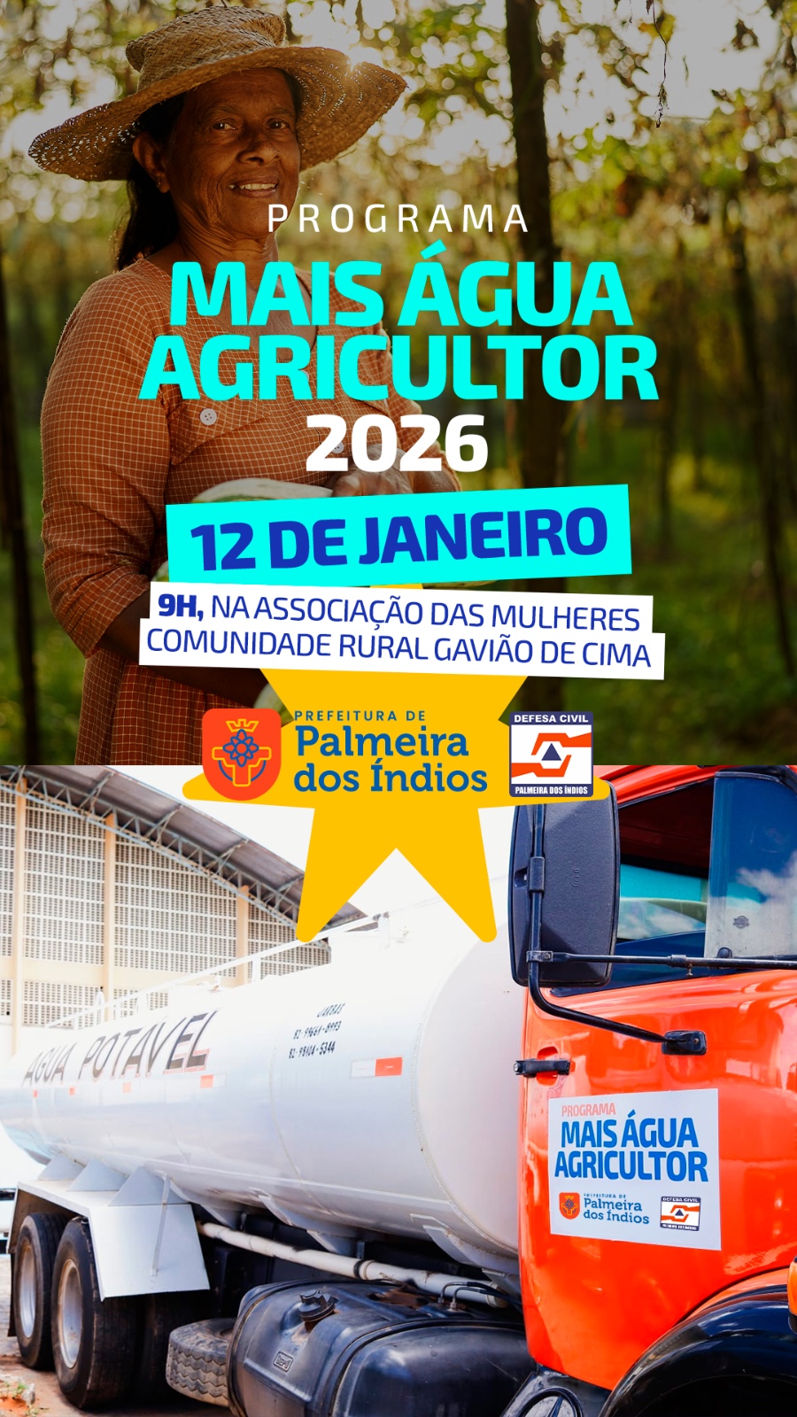 A Prefeitura de Palmeira dos Índios retomará a partir de segunda-feira (12) o Programa Mais Água Agricultor 2026. A iniciativa é voltada ao enfrentamento dos efeitos da seca na zona rural do município. A ação é coordenada pela Defesa Civil Municipal e tem como objetivo garantir o abastecimento de água potável para famílias que vivem nas comunidades mais afetadas pela estiagem. A solenidade de lançamento acontecerá na comunidade Gavião de Cima, as 9h.