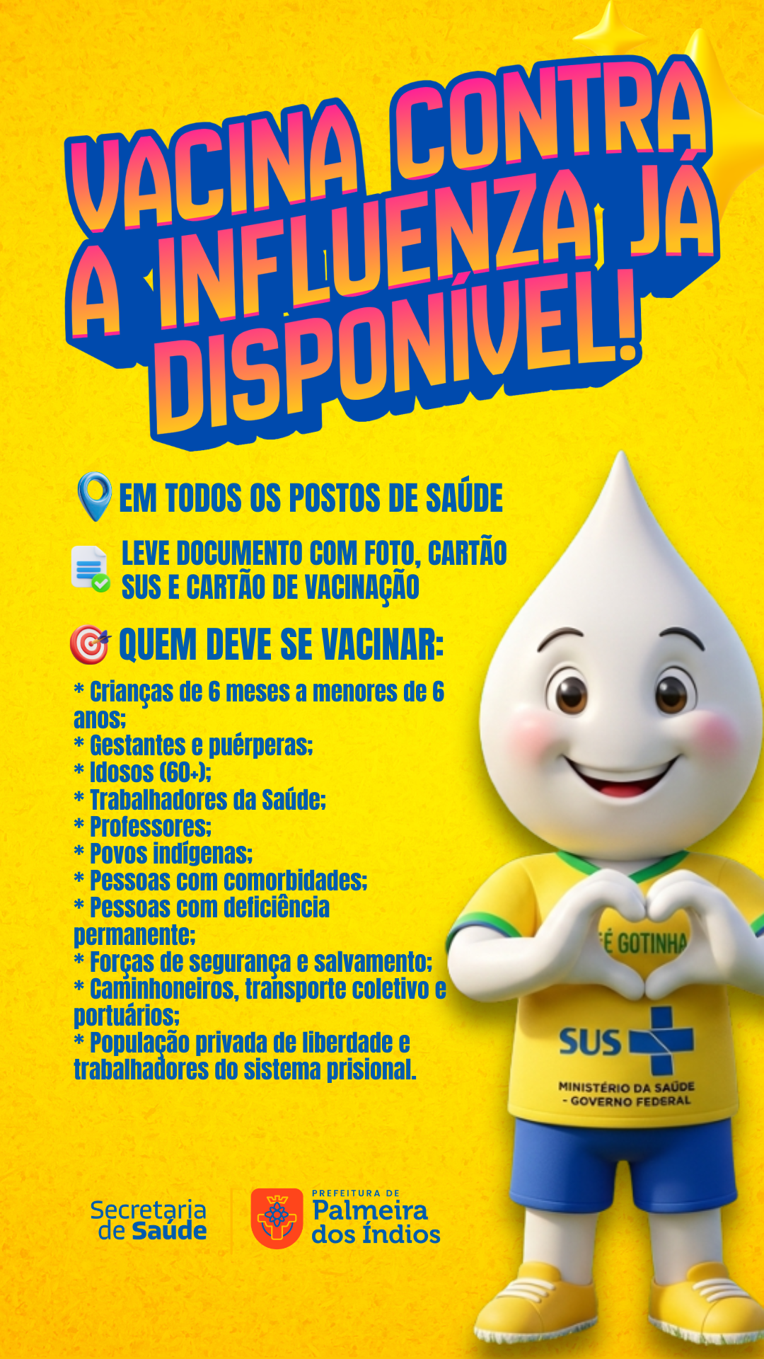 A Secretaria de Saúde de Palmeira dos Índios (SMS) inicia nesta quarta-feira (08) mais uma campanha de vacinação contra a gripe. O imunizante contra a Influenza já está disponível em todos os postos de saúde das zonas urbana e rural. Para tomar a vacina, a SMS pede que a população apresente algum documento com foto, cartão SUS e caderneta de vacinação.